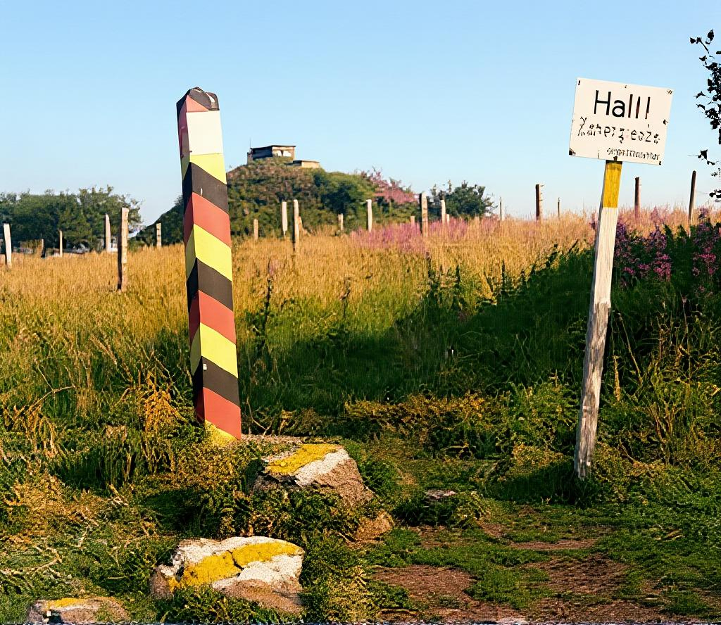 The DDR [East Germany] as if to enforce the notion of national sovereignty, placed these concrete markers with aluminum crests of the national seal all along the border, back from the actual line by about two meters. Clearly visible but just out of reach, they were placed even in the deep woods or swamps.