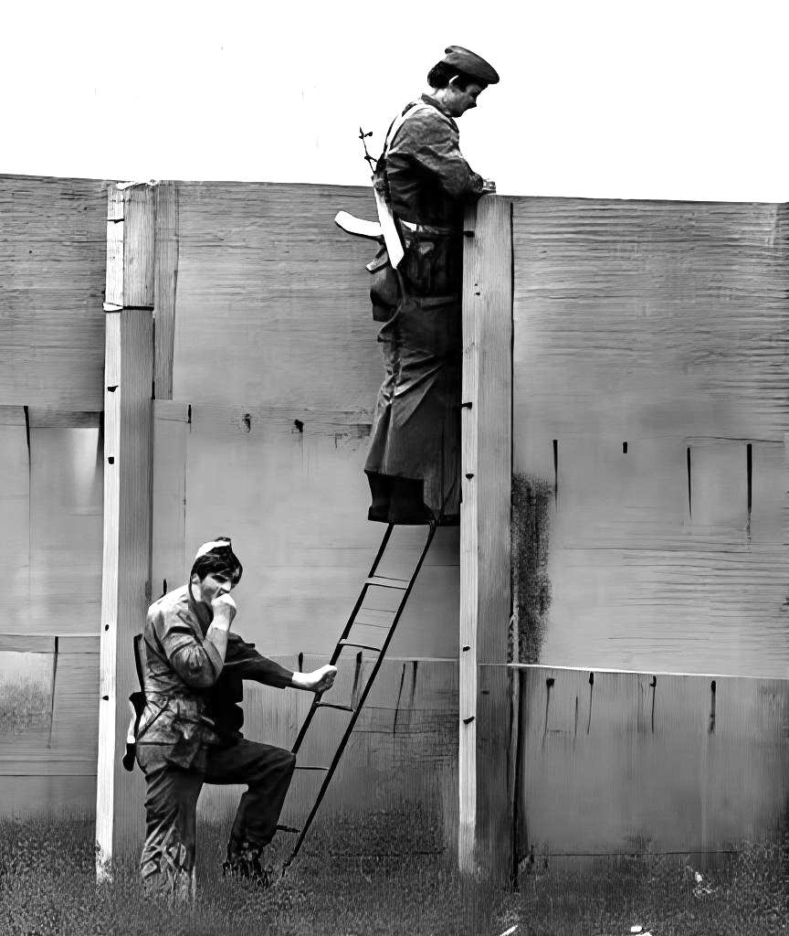 The companies of Border Troops, to secure the border barrier system, used a variety of mobile patrols. Often seen on the control road were any number of light wheel vehicles and trucks. Dismounted patrols carefully checking the plowed strip as well as motorcycle patrols were also common. These images, both of actual events seen on our border and scans from Border Troop manuals and recruiting brochures reflect typical scenes.